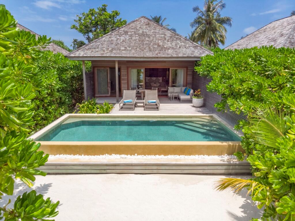Unwind in the Beach Pool Villa, featuring a private pool, and a secluded deck area surrounded by lush greenery. Enjoy the serenity of the open-air bathroom and a tranquil ambience designed for an unforgettable island retreat.